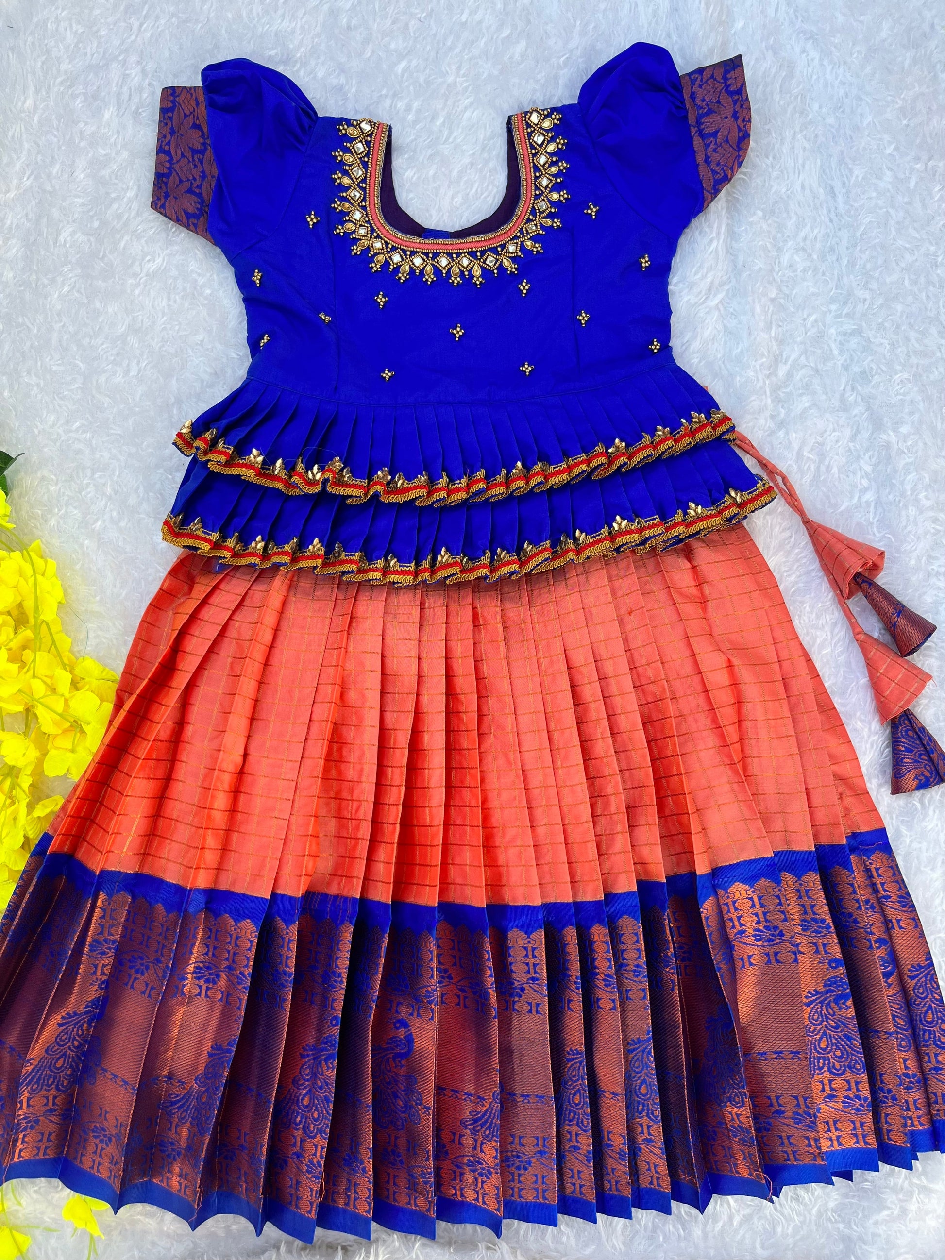 This premium orange skirt with a big border and blue top features 2 layers of intricate Aari work. Its new design is perfect for special occasions, adding a touch of sophistication and elegance. Expertly crafted, this skirt promises to make a statement and elevate any outfit.