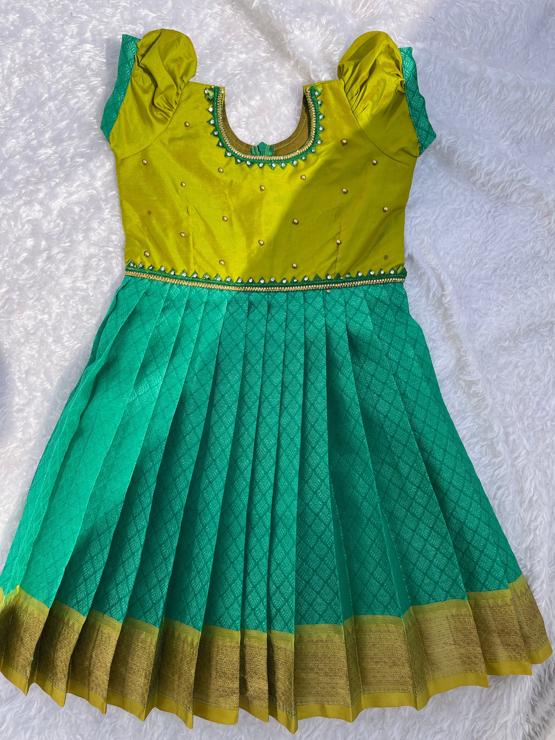 Experience the vibrant energy of the Yellow Sunshine Frock! Adorned with intricate aari work, this dress is a perfect harmony of style and comfort. Radiate confidence and elegance in this stunning piece that is sure to turn heads.